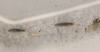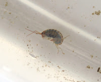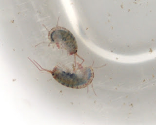 I took a look at my specimens. The bigger one is close to 8mm; the smaller about 6mm or so. They are shiny blue grey to my eye, with reddish antennae (4 of them) and legs (um, didn't count those). They don't stay still for long, scooting or scuttling around and around the bottom of the container. From time to time the two meet on their travels and interact by laying on their sides and moving their antennae around. I never see them rise to the surface of the water. They seem content in, or at least adapted to their aquatic environment.