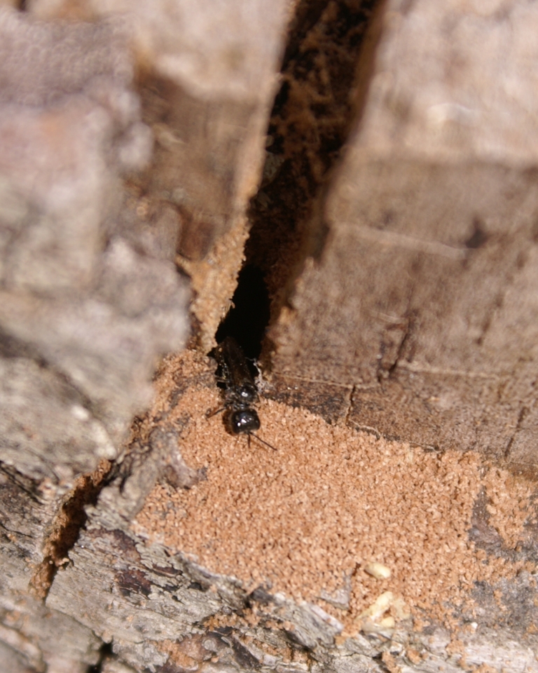 Next day on closer inspection I found many little piles of sawdust being pushed out of smallish holes riddling the bark of the stump. Occasionally a small black head or tip of an abdomen belonging to the same type of critters that were flying around the stumped would pop out of a hole. So the black swarmers were tunneling in the stump. Finally one of them fully emerged, paused for a moment, then flew off. It looked like a small (1/4 inch or so) black bee. This was about 9 am and the stump was still in the shade.